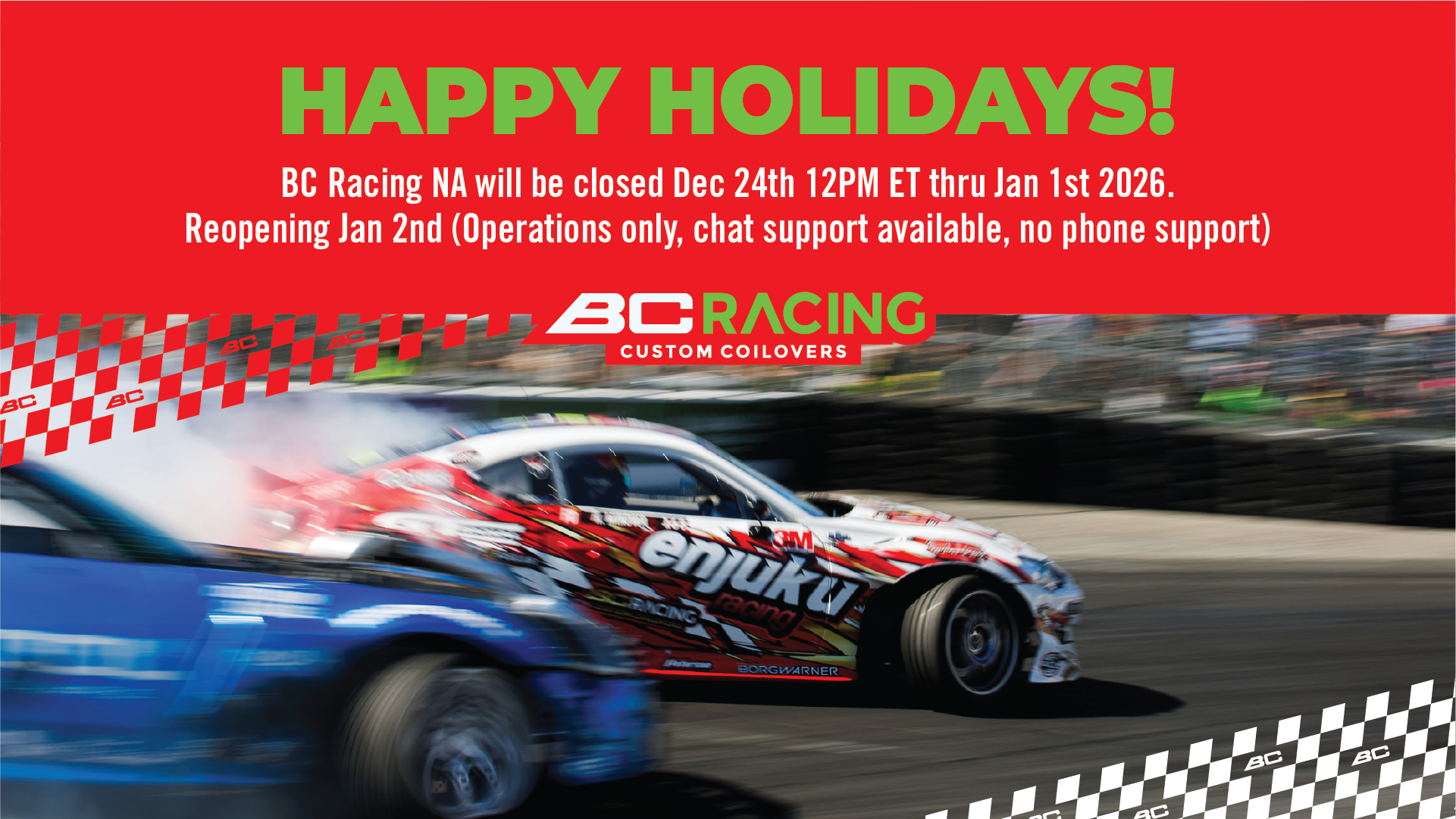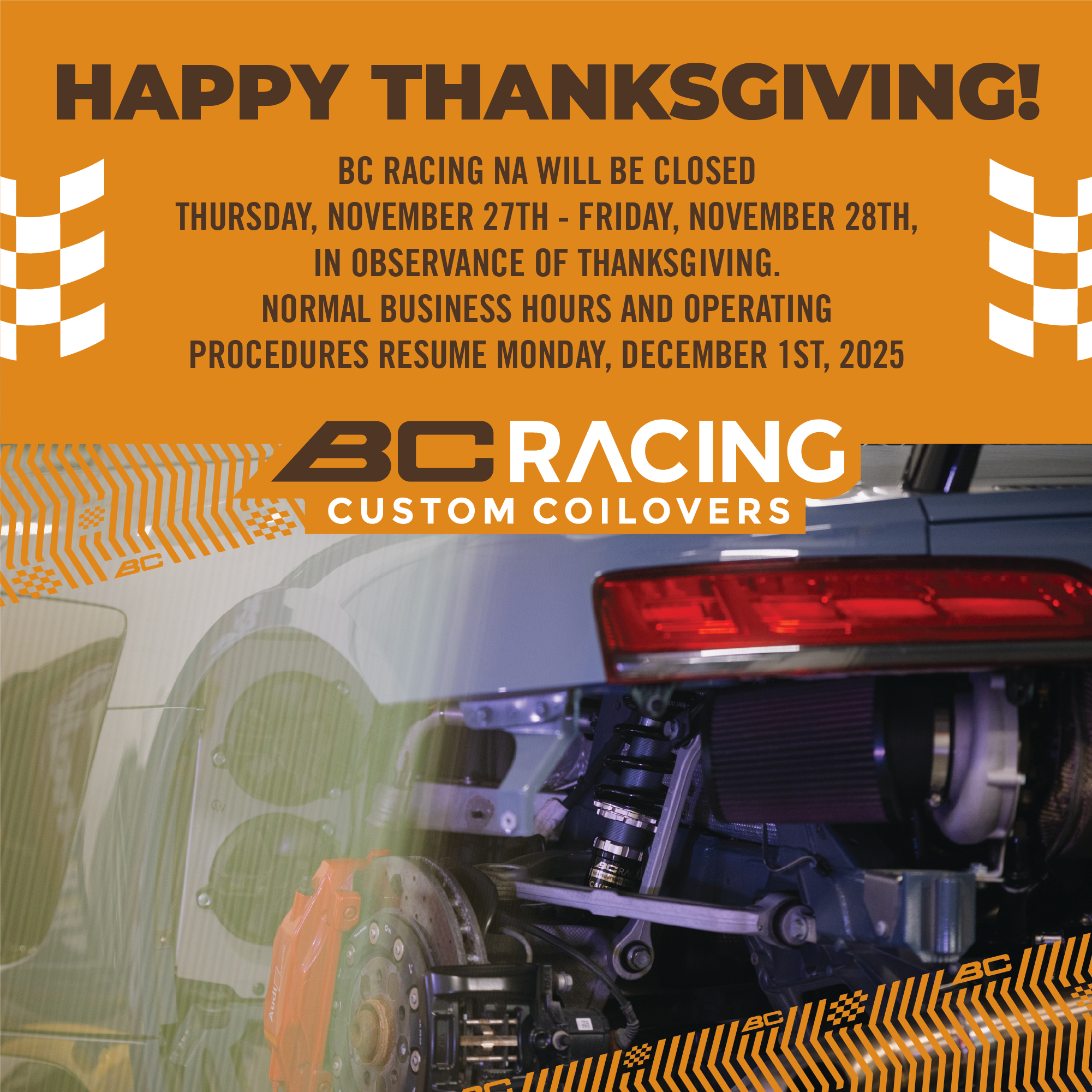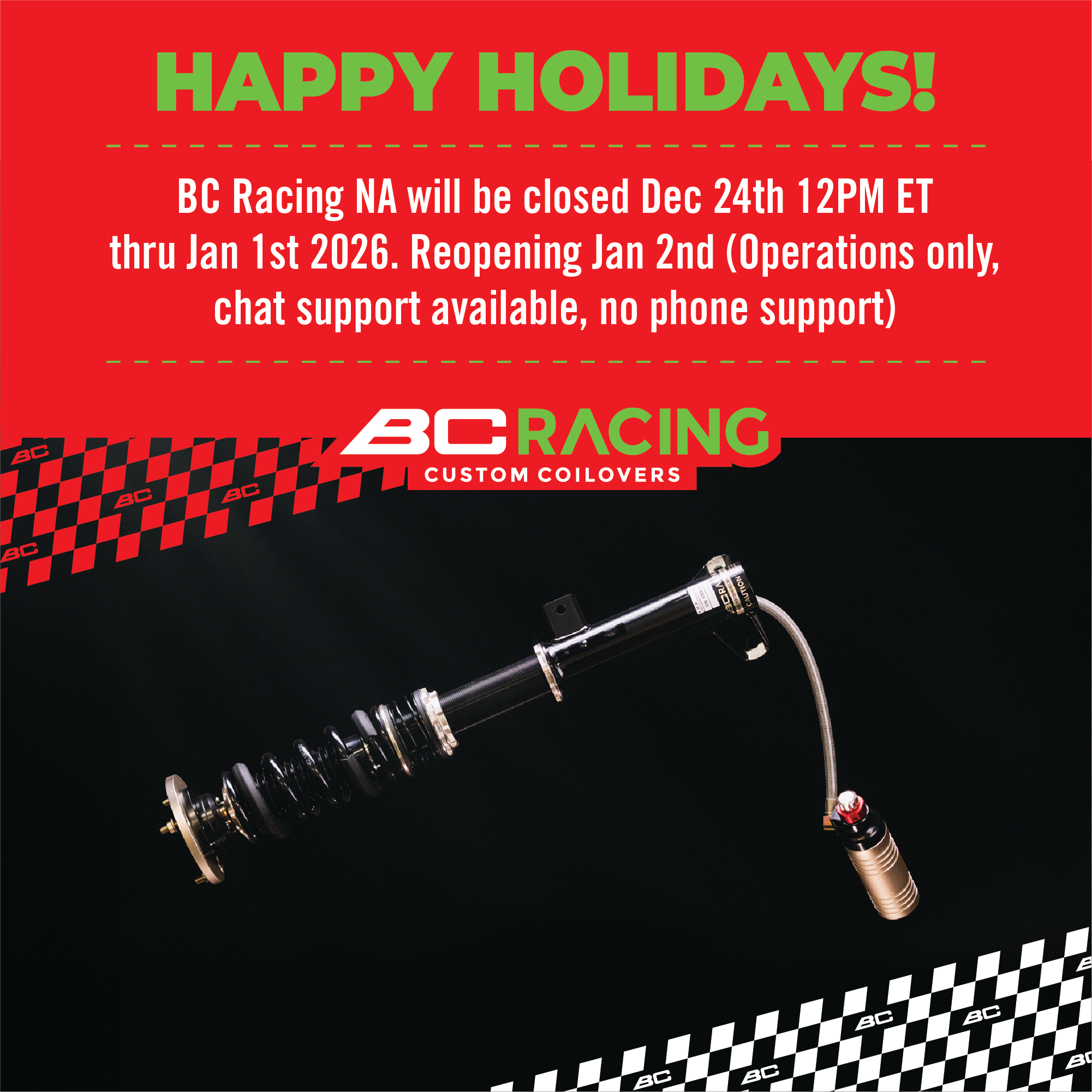 BC Racing North America will be transitioning into Netsuites as our new ordering system, effective March 1st 2023. All ordering access into the current ordering portal (nowcommerce) will be suspended on Friday February 24th at 3:30 pm EST. Order history that has been fulfilled on/or prior to 2/24/23 will remain in the old portal.